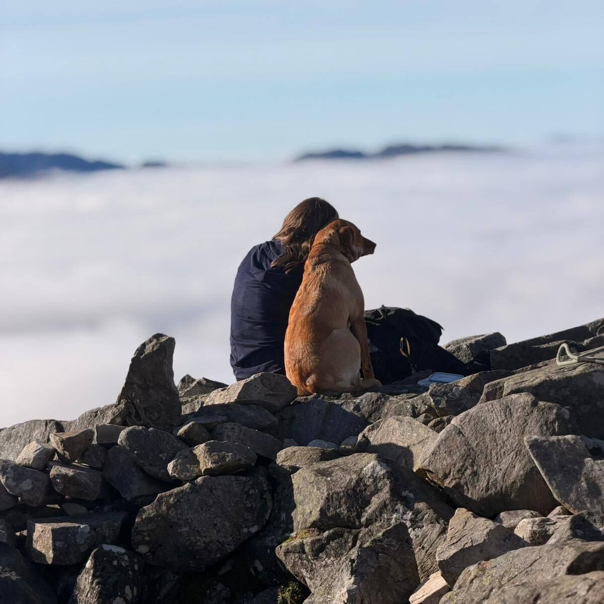 Then we settled down on the rocks and simply absorbed it. Eventually others began to appear, climbing up out of the cloud, and I stayed for nearly two hours sunbathing, chatting to other walkers, reluctant to leave. One lady approached me telling me she had taken a photograph of Nala and I sitting together and asked if I'd like her to send it to me - I've included the photo here for you to see.